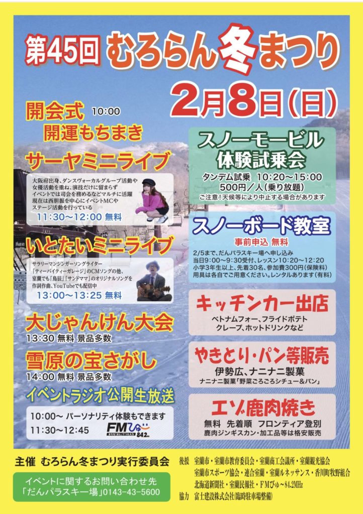 2026.02.07 【特別番組のお知らせ】だんパラ冬まつりラジオ 2026年2月8日(日)11:30~12:45「むろらん冬まつり」だんパラスキー場から生放送!ラジオを聴きながらイベント情報をチェック! Screenshot 前の記事へ 一覧へ戻る 最近のお知らせ一覧 【特別番組のお知らせ】だんパラ冬まつりラジオ 【参加者募集】FMびゅー無料オンラインマネーセミナー 【新年ご挨拶】2026年1月1日 【特別番組のお知らせ】FMびゅーあけましておめでとう 月別一覧 2026年2月 (3) 2026年1月 (1) 2025年12月 (7) 2025年11月 (2) 2025年10月 (2) 2025年9月 (3) 2025年8月 (8) 2025年7月 (4) 2025年6月 (6) 2025年5月 (2) 2025年3月 (3) 2025年2月 (5) 年別一覧 2026 (4) 2025 (46) 2024 (27) 2023 (39) 2022 (36) 2021 (6) カテゴリ イベント (3) 番組情報 (1)